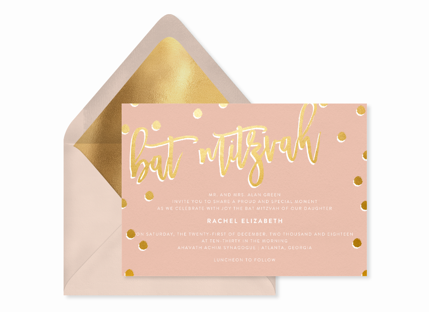 Complete with eye-catching shimmer, this bat mitzvah invitation features a loose script font, festive polka dots, and trendy gold foil.