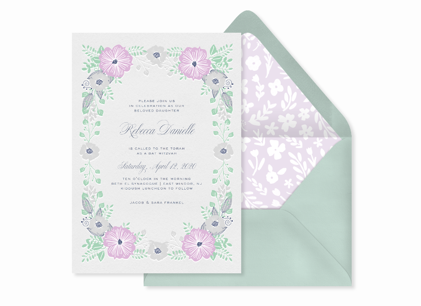 This beautiful mitzvah invitation features a hand drawn floral frame in a letterpress effect. Perfect for a spring or summer affair with close friends and family to celebrate a milestone moment.