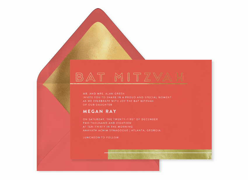 With a modern layout and minimalist style, this bat mitzvah invitation is sure to make a statement. With a touch of elegant gilded foil, just select which color matches your event best (we are particularly fond of the bold coral) and make a chic first impression.