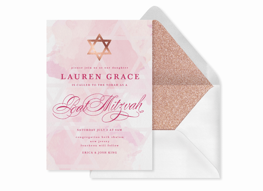 This beautiful bat mitzvah invitation from Phrosne Ras features a hand-painted watercolor background, lavish calligraphy, and a Star of David in beautiful rose gold foil.