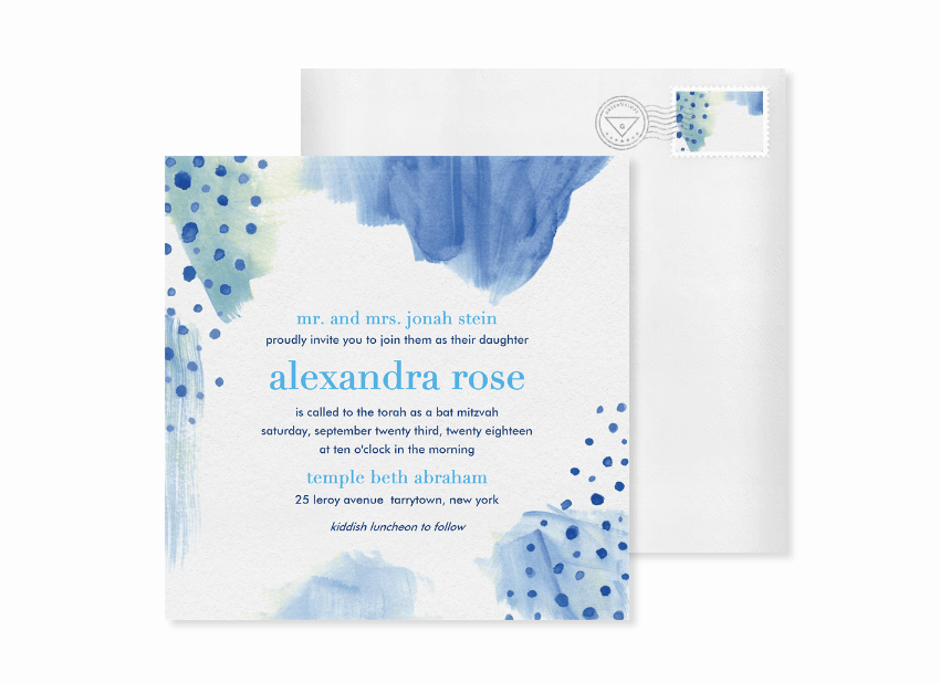 Soft monochromatic watercolor will beautifully frame the details of your celebration in this feminine bat mitzvah invitation. Available in four different colors, it’s a lovely way to announce your daughter’s rite of passage.