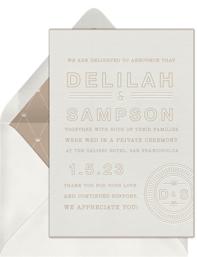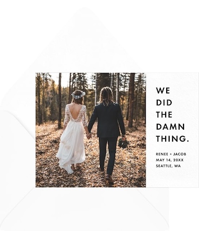 Let your loved ones know that you’re already married with this Did the Damn Thing wedding announcement card. It’s perfect for a casual, straightforward, and modern announcement with a touch of humor.