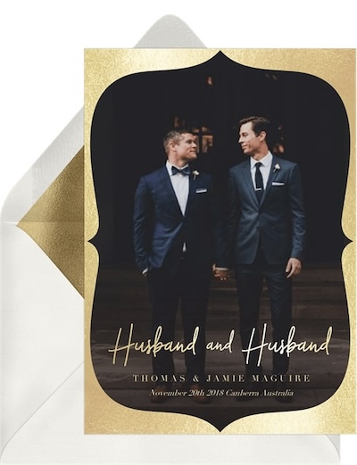 Look for photo wedding announcement cards with space for several photos — perfect if you have a few snaps you’d like to share from your big day. We also have elopement announcements, like this We Couldn’t Wait announcement card, if that suits the occasion.