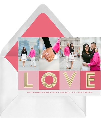 If you’re looking for something that stands out, this photo wedding announcement card is the way to go. The fresh, bright color options are a bold alternative to more traditional or minimalist designs — and there’s space for four of your favorite wedding or couples photos, too.