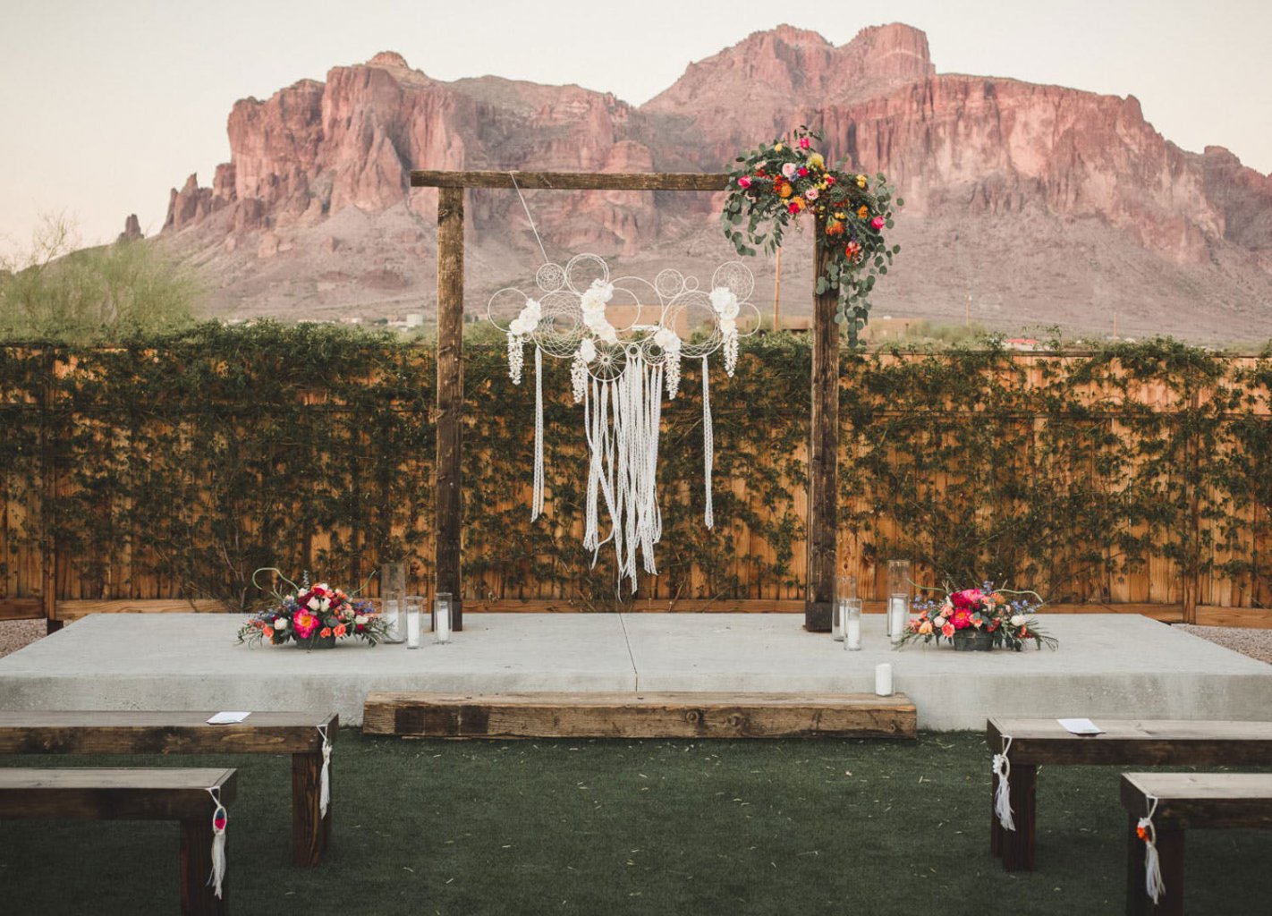 If your ceremony location happens to come with a stunning view, why not create a simple wooden altar to show off the natural beauty of your surroundings? We just love how this couple, featured on PureWow, added a few boho touches for emphasis. It’s the perfect complement to the changing season.