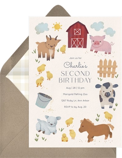 Plan a cowboy birthday party for your little rider with this adorable barnyard invite. With baby pigs, goats, sheep, and cows, it’s ideal for a farm-themed celebration. Use it as a cowboy birthday invitation or a farm-themed baby shower.