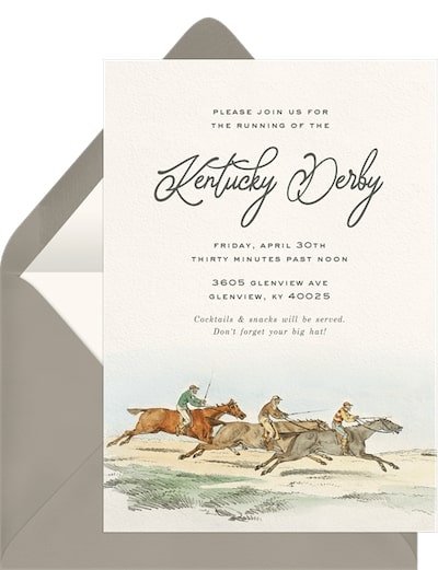 Host a western–themed party to watch the Kentucky Derby with this watercolor design. Featuring three racing horses and jockeys, it offers a rugged and rustic vibe. The “Kentucky Derby” text is removable so you can customize the words and use it for a wide range of celebrations.