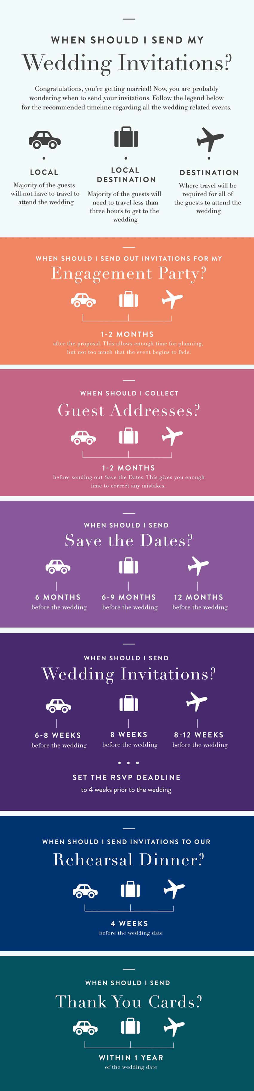 From engagement party invitations to save the dates, we’ve compiled a recommended timeline of when to send wedding invitations and all of your other requests for wedding-related events. Plus, you can pin the infographic below to your wedding planning board on Pinterest for quick reference later on.