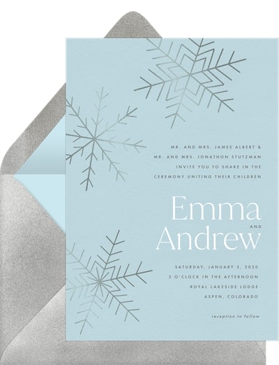 If your budget allows for it, go all out and book a destination wedding that truly feels magical — like a traditional winter wedding in New York or a wedding in Lapland. Wherever you choose to host your winter wonderland wedding, use a fun matching invite to share the news — like this stunning snowflake invitation.