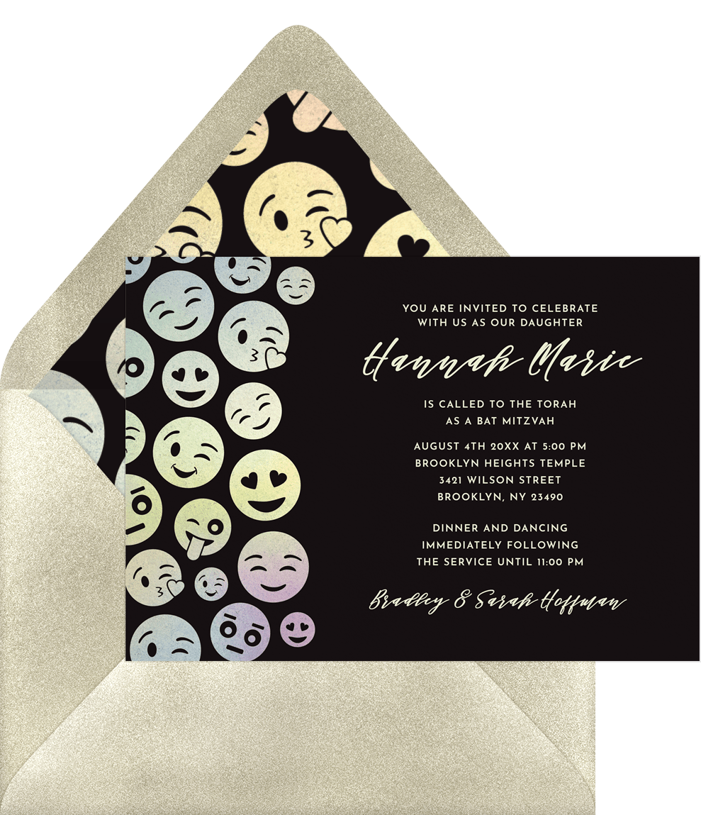 invitations emojis black bat mitzvah Designs