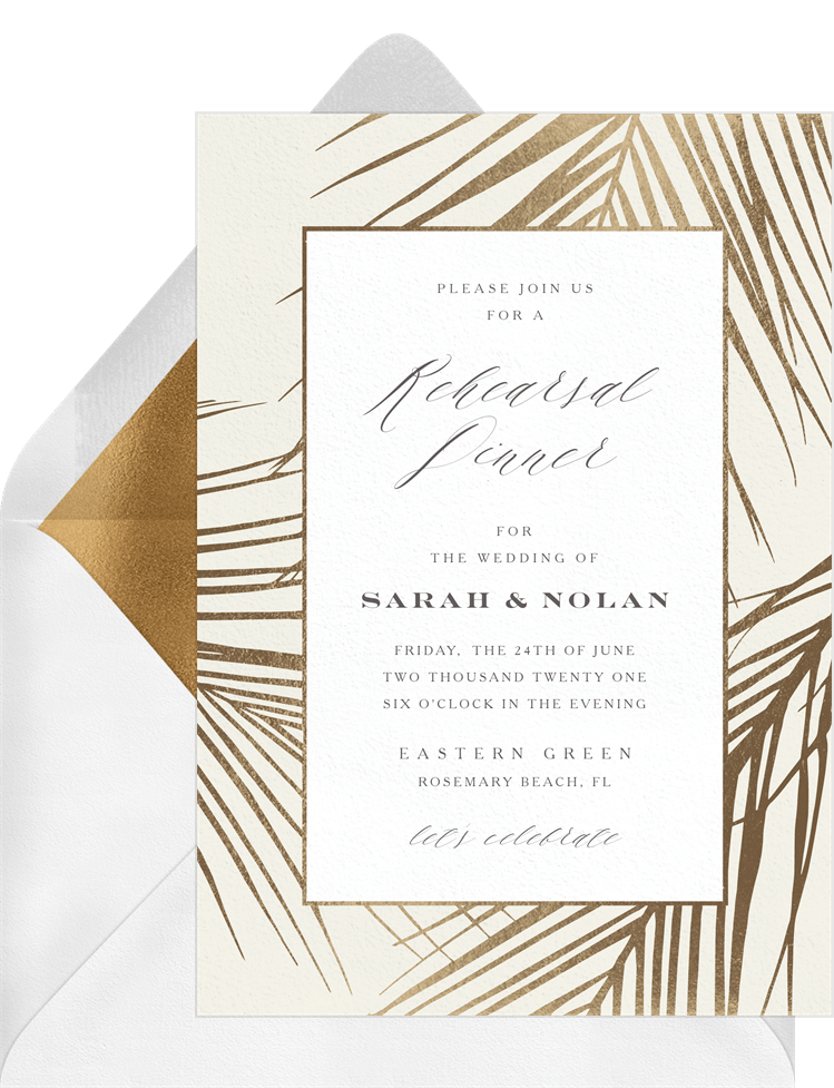 invitations guilded palm fronds creme rehearsal dinner Designs
