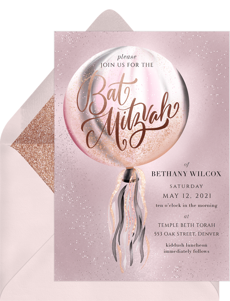 invitations iridescent confetti balloon pink bat mitzvah Designs