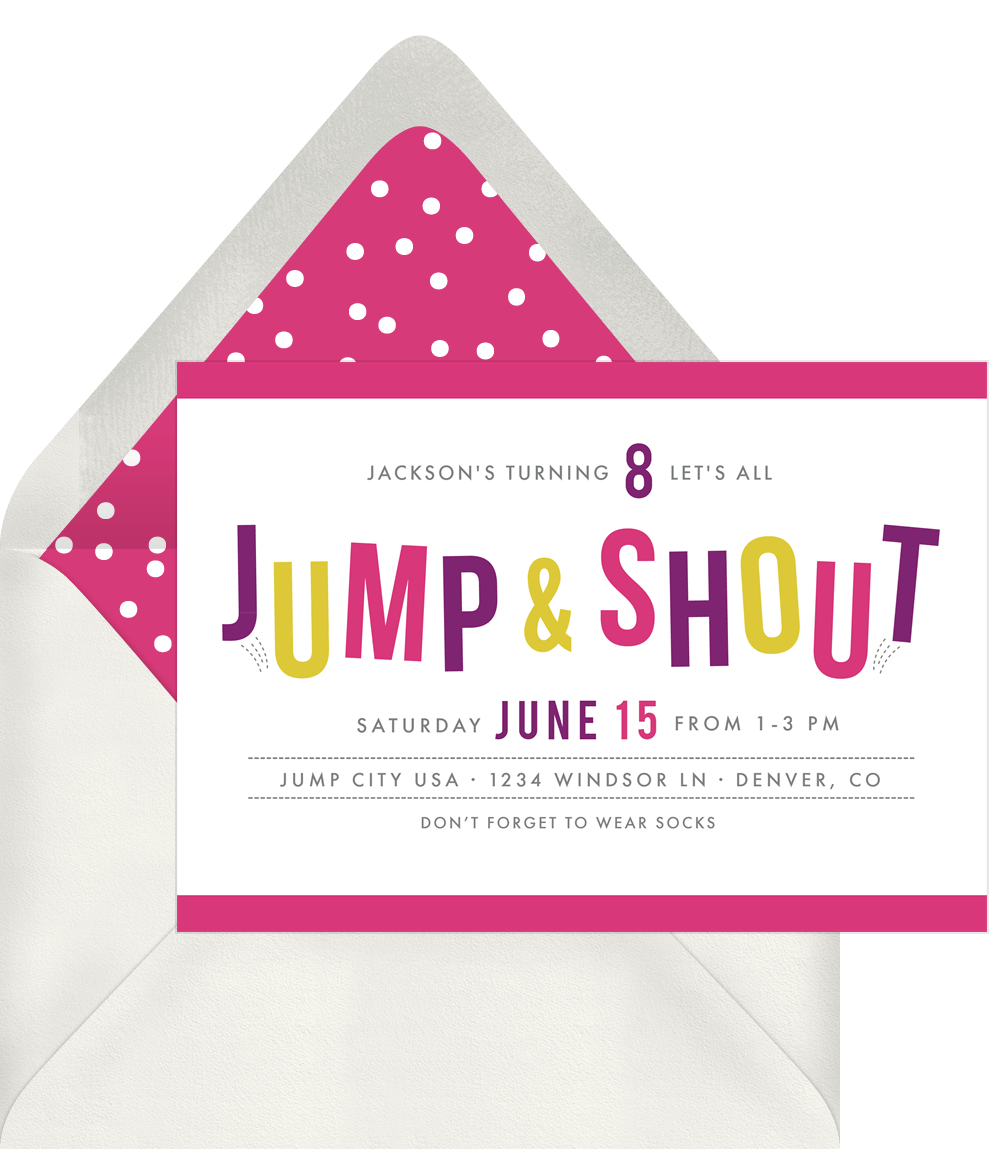invitations jump and shout pink kids birthday Designs