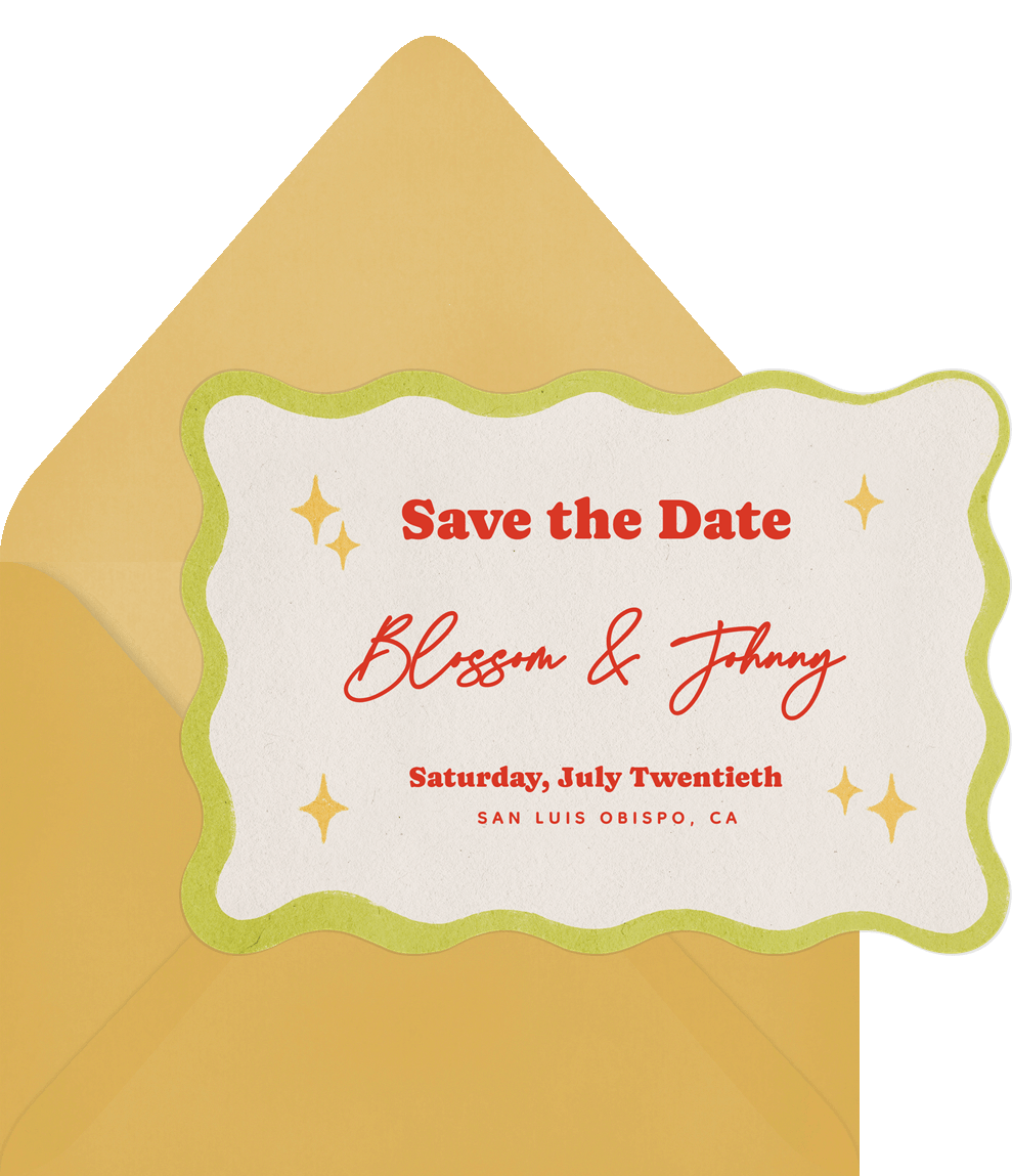 save the dates boho disco green wedding Designs