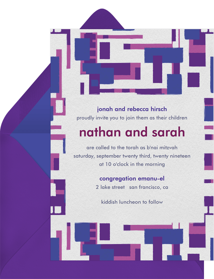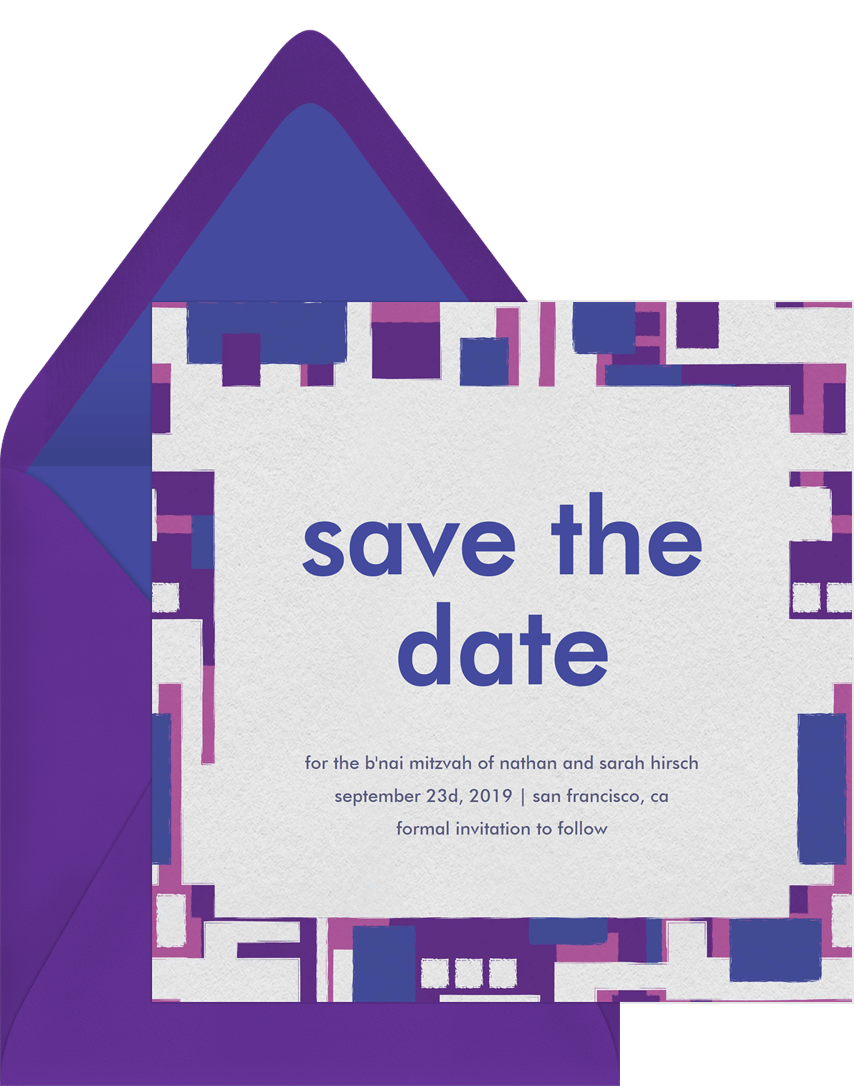 save the dates bold mosaic purple bat mitzvah Designs