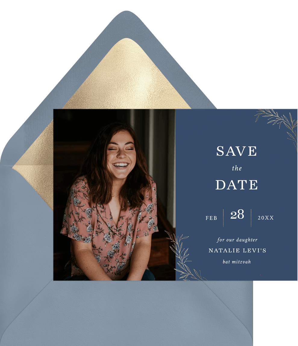 save the dates delicate corner sprigs orange bat mitzvah Designs