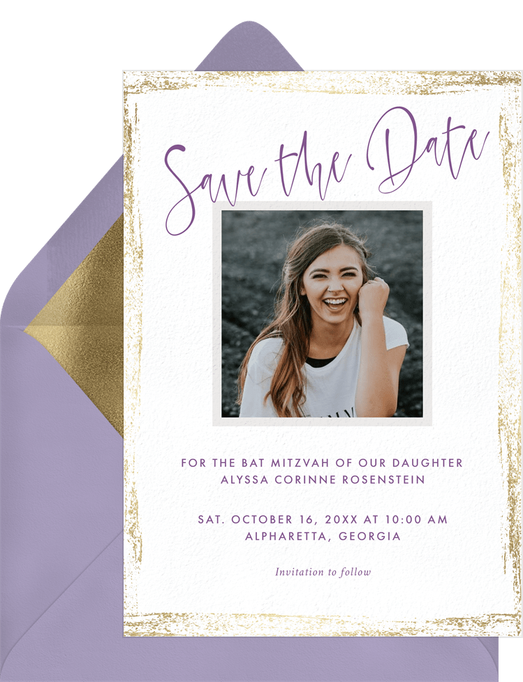 save the dates gold brushed edges white bat mitzvah Designs
