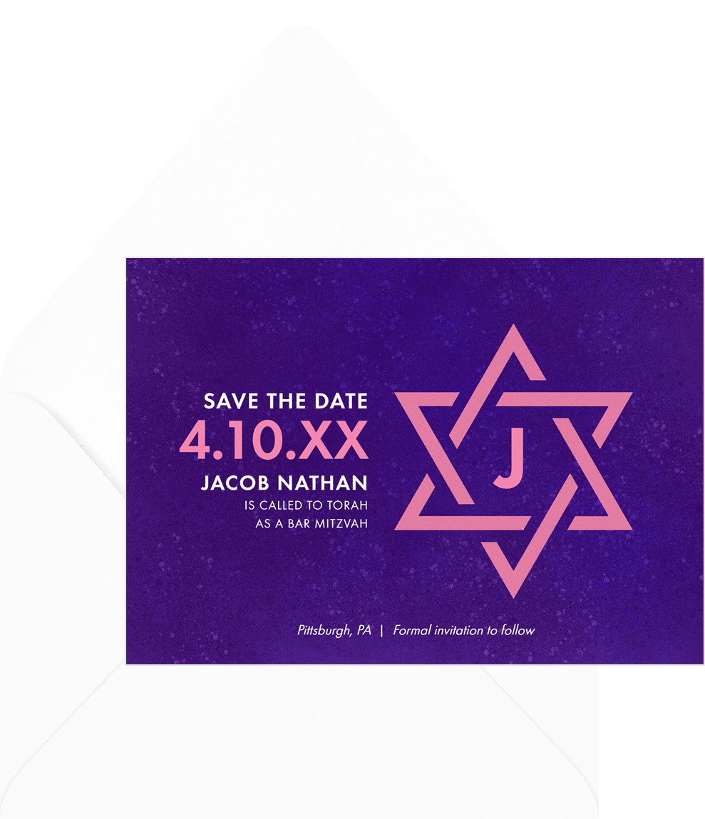 save the dates interstellar mitzvah purple bar mitzvah Designs