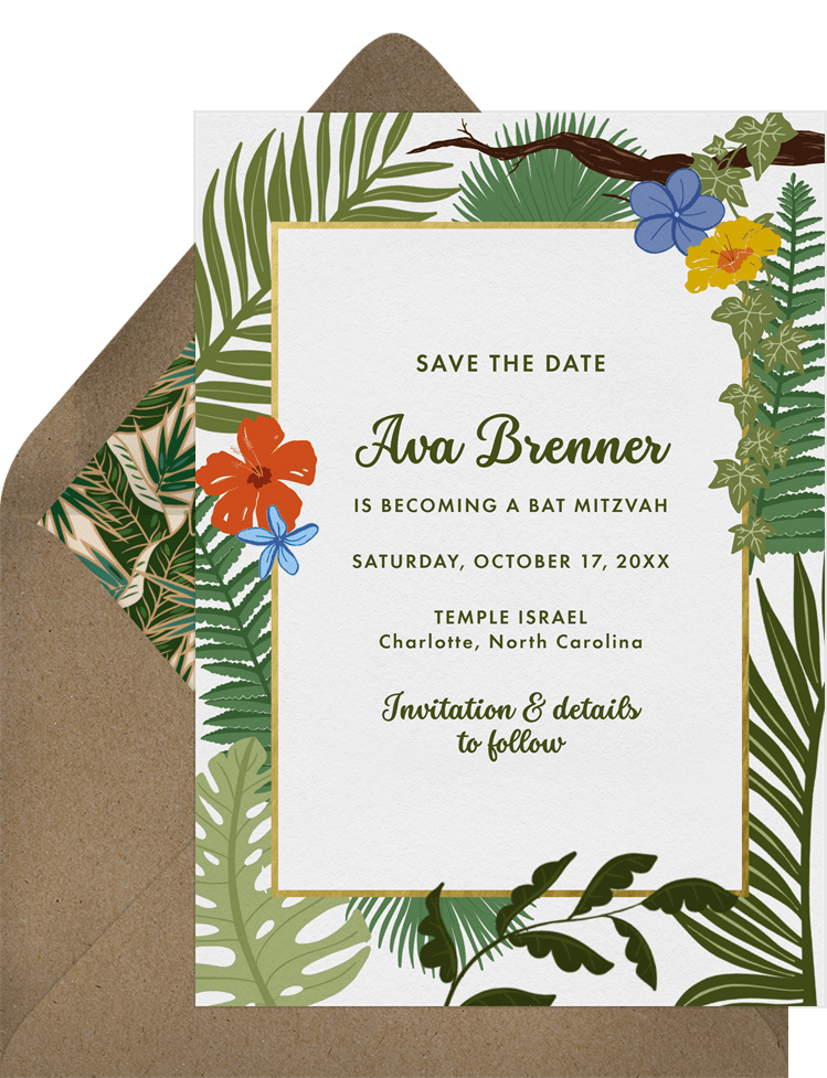 save the dates jungle palms green bat mitzvah Designs