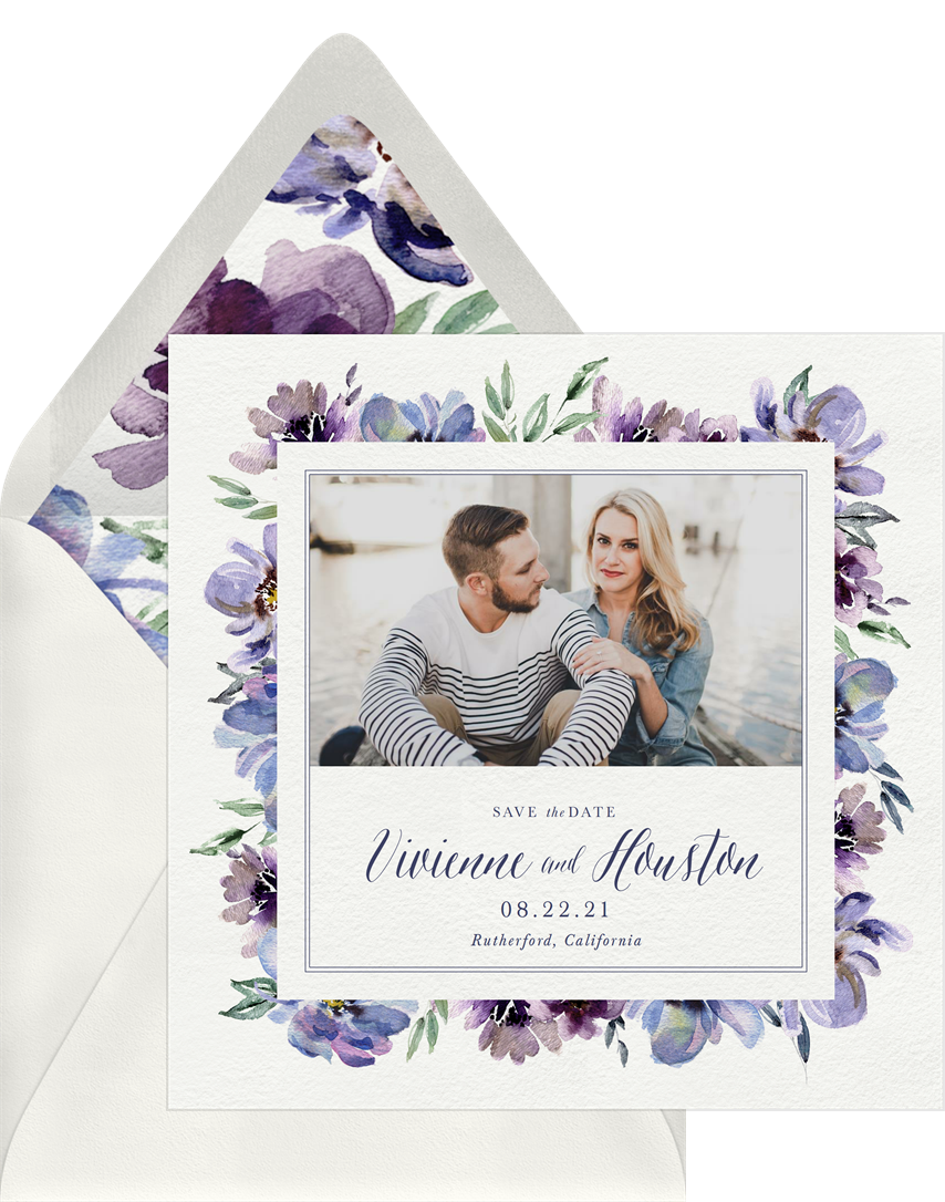 save the dates perennial crest purple wedding Designs