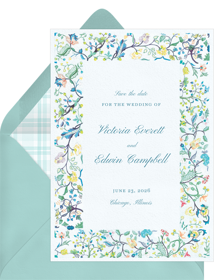 save the dates vibrant garden blue wedding Designs
