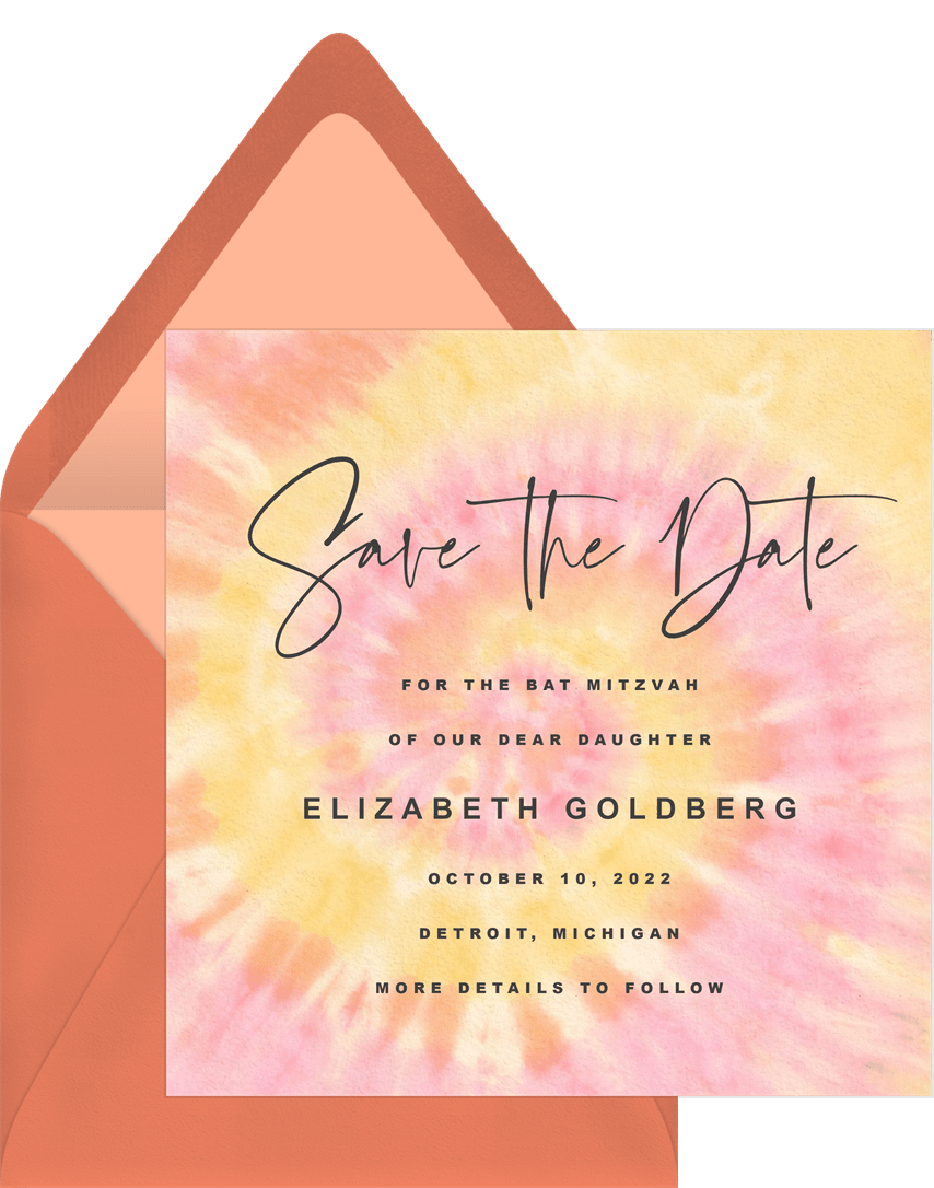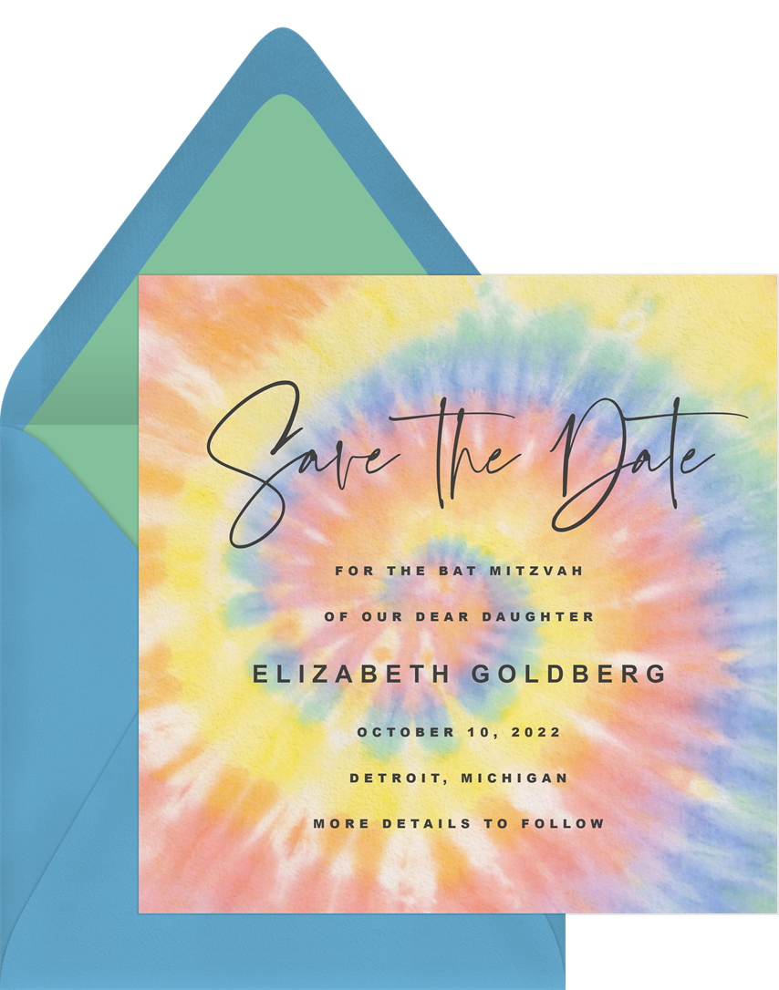 save the dates vintage tie dye blue bat mitzvah Designs