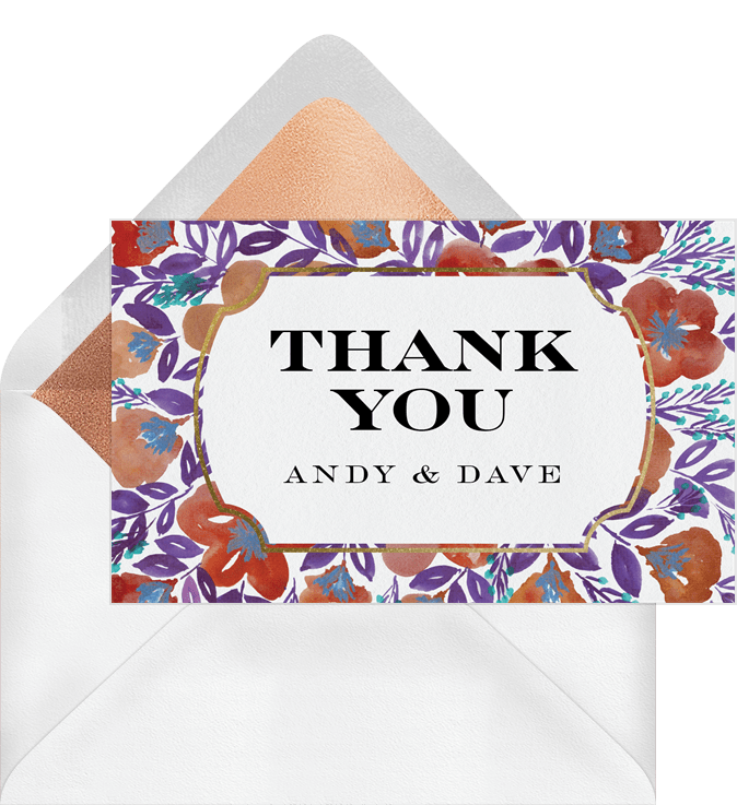 thank you notes bold blossoms border purple wedding Designs